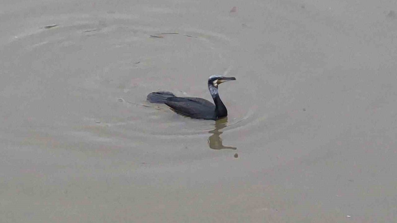 Eskişehir'de Porsuk Çayı'nda avlanmaya çalışan Karabatak cinsi bir kuş dikkat çekti.