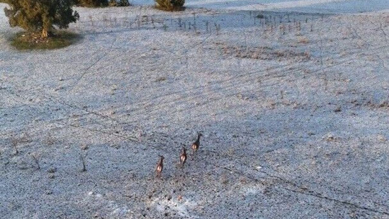 Mihalıççık ilçesi kırsal Çardak Köyü'nde doğa gezisi yapan ve dron ile karla kaplı dağları görüntülüyen Çağlar Memiş'in kadrajına 4 geyik takıldı. Karla kaplı tarım arazisinde koşuşturan geyiklerin özgürce koşusuna odaklanan Memiş, eşsiz manzaranın yanı sıra sevimli hayvanları da kaydetmiş oldu. Bir süre koşuşturan geyikler, ormanın derinliklerinde kayboldu.