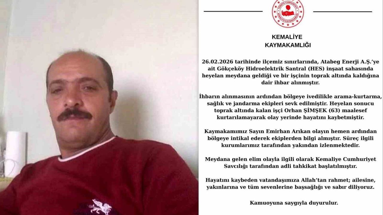 Açıklamada, Kemaliye ilçesinde, Atabeg Enerji A.Ş.'ye ait Gökçeköy Hidroelektrik Santral (HES) inşaat sahasında heyelan meydana geldiği ve bir işçinin toprak altında kaldığı yönünde ihbar alındığı belirtildi.