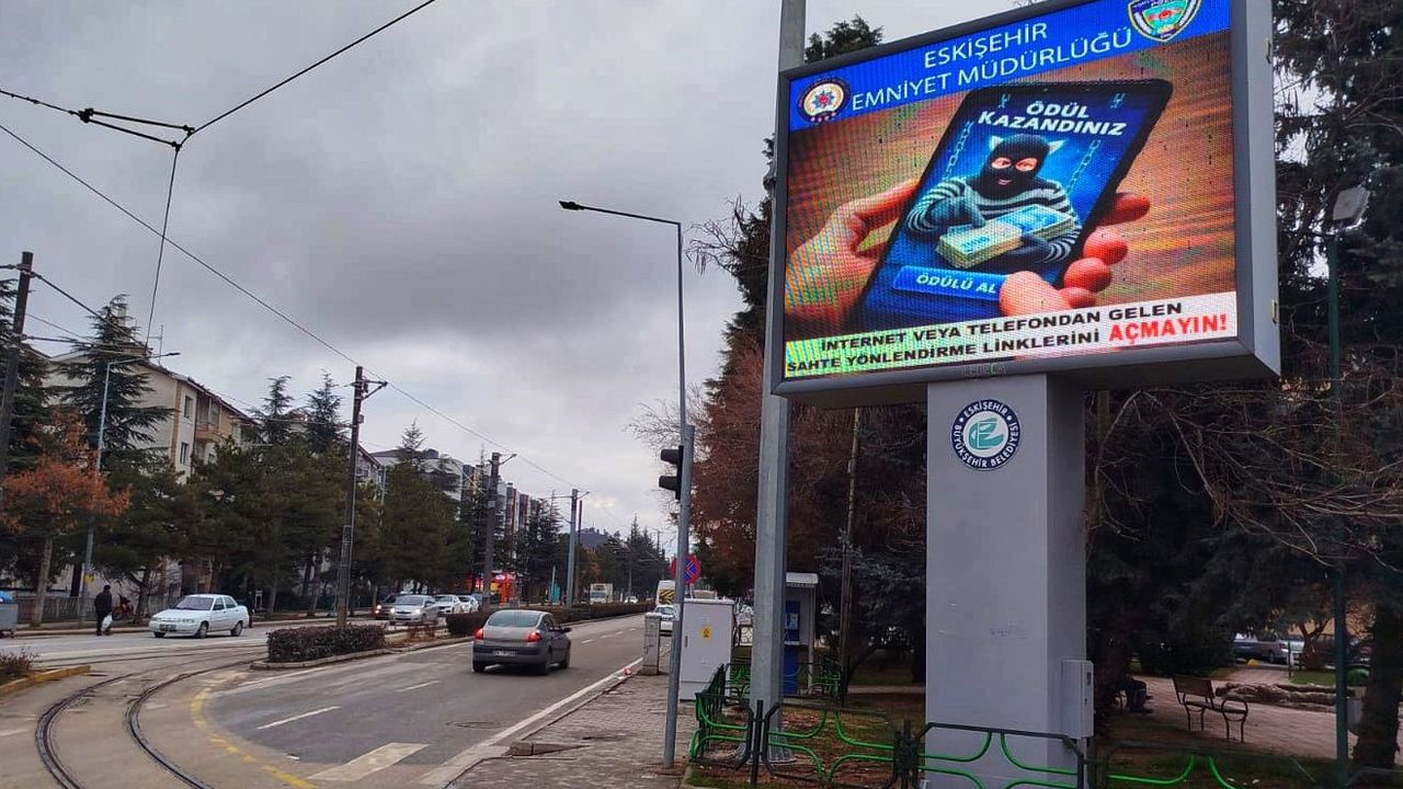 Eskişehir'de polis ekiplerince hazırlanan hırsızlık ve dolandırıcılık konulu dijital uyarı metinleri, kentteki LED ekranlara yansıtılmaya başlandı.