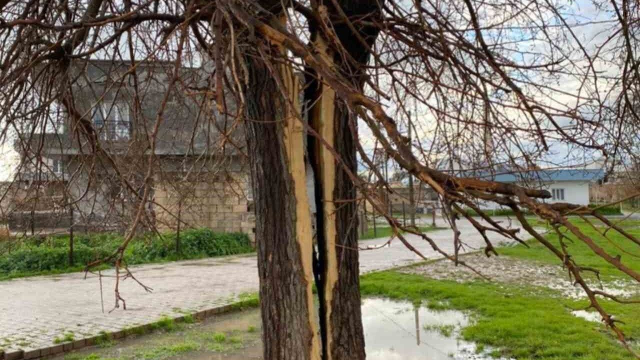 Mardin'in Kızıltepe ilçesinde etkili olan gök gürültülü sağanak sırasında yıldırımın isabet ettiği ağaç ortadan ikiye bölündü.