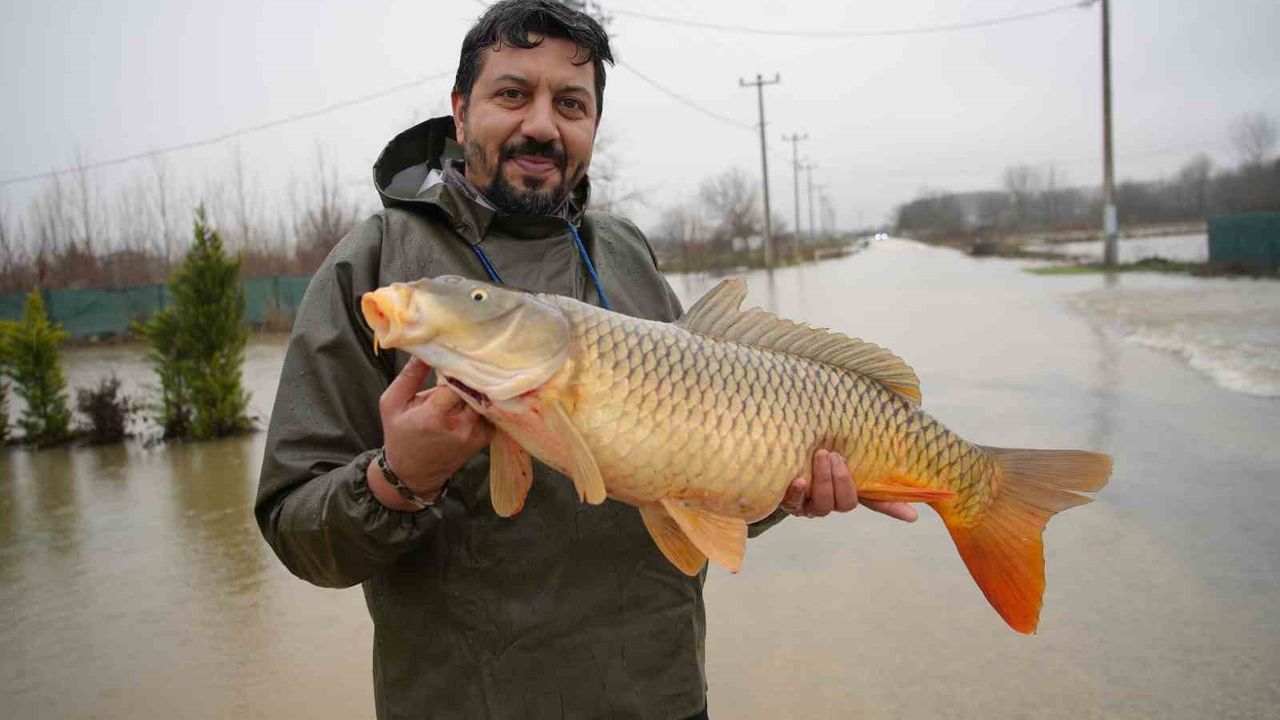 Edirne'de Meriç Nehri'nin taşmasının ardından bir vatandaşın tarlasında ortaya çıkan yaklaşık 7 kilogramlık sazan balığı, taşkının bıraktığı ilginç görüntülerden biri oldu.