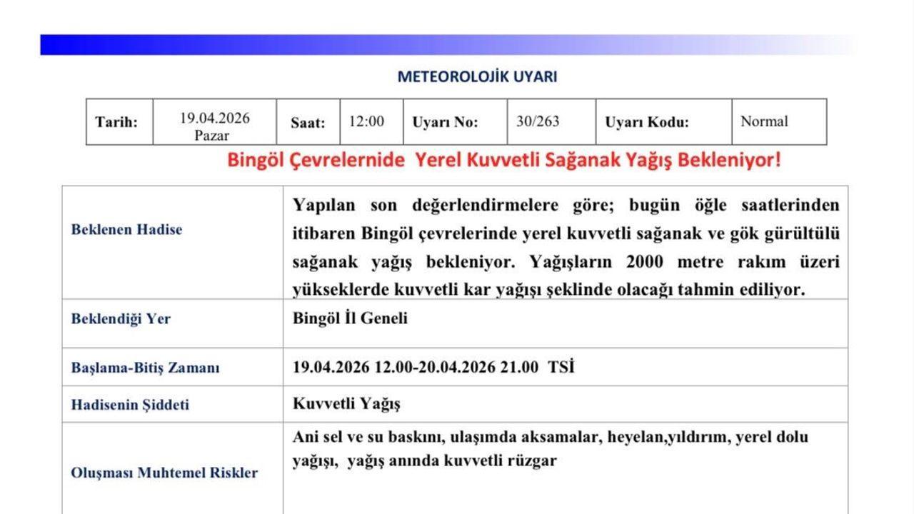 Meteoroloji 13. Bölge Müdürlüğü tarafından yapılan açıklamada, 'Yapılan son değerlendirmelere göre; bugün öğle saatlerinden itibaren Bingöl çevrelerinde yerel kuvvetli sağanak ve gök gürültülü sağanak yağış bekleniyor. Yağışların 2000 metre rakım üzeri yükseklerde kuvvetli kar yağışı şeklinde olacağı tahmin ediliyor. Oluşması muhtemel risklere karşı tedbirli ve dikkatli olunması gerekmektedir' denildi.