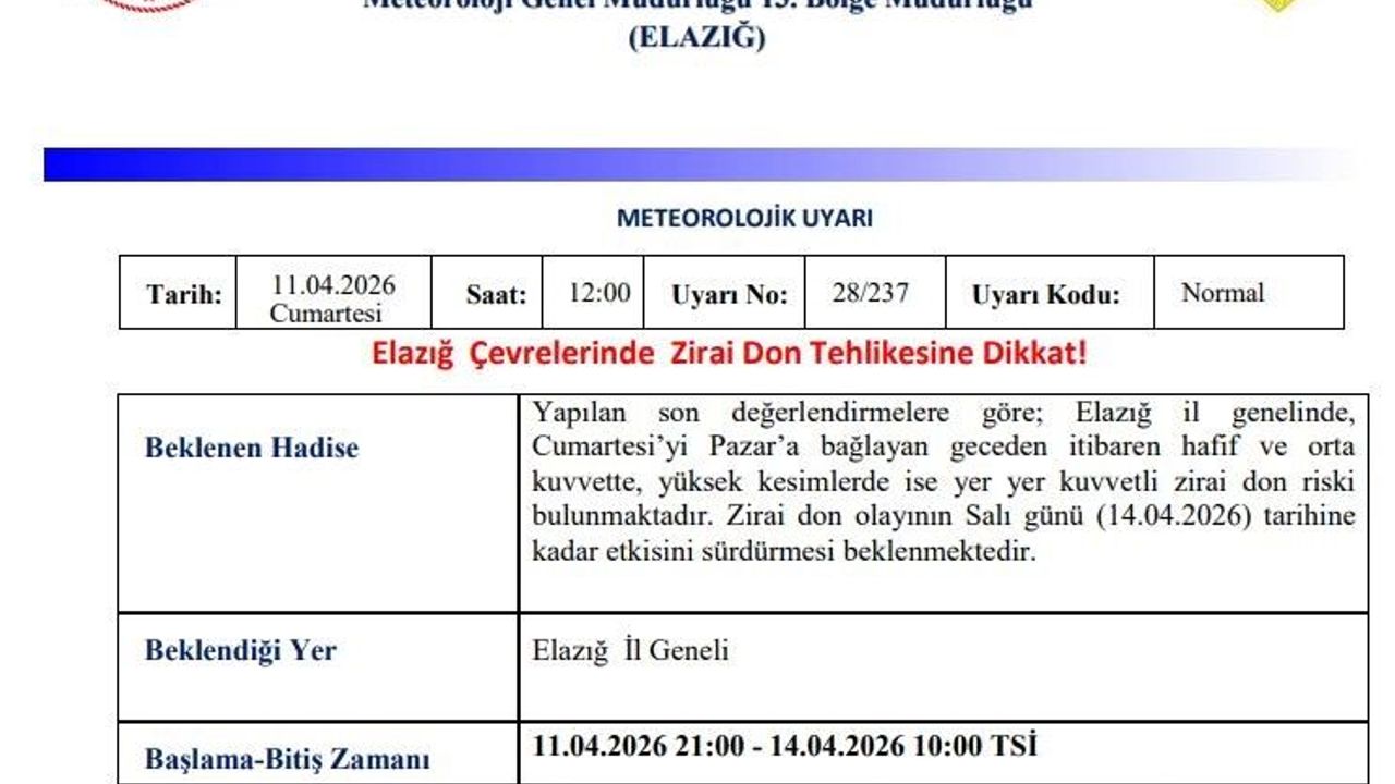 Meteoroloji 13. Bölge Müdürlüğü'nden yapılan açıklamada, 'Yapılan son değerlendirmelere göre; Elazığ il genelinde, cumartesiyi pazara bağlayan geceden itibaren hafif ve orta kuvvette, yüksek kesimlerde ise yer yer kuvvetli zirai don riski bulunmaktadır. Zirai don olayının Salı günü (14.04.2026) tarihine kadar etkisini sürdürmesi beklenmektedir' denildi.