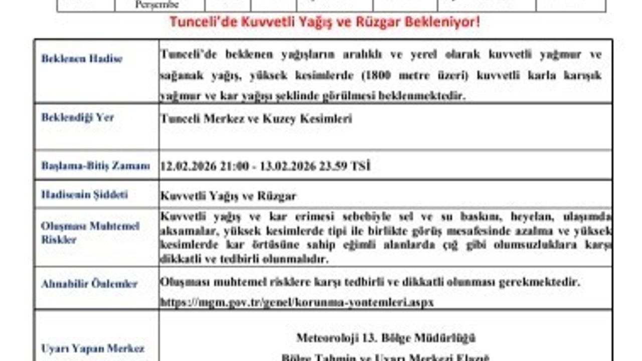 Meteoroloji 13. Bölge Müdürlüğünden yapılan açıklamada, 'Tunceli'de beklenen yağışların aralıklı ve yerel olarak kuvvetli yağmur ve sağanak yağış, yüksek kesimlerde (1800 metre üzeri) kuvvetli karla karışık yağmur ve kar yağışı şeklinde görülmesi beklenmektedir. Kuvvetli yağış ve kar erimesi sebebiyle sel ve su baskını, heyelan, ulaşımda aksamalar, yüksek kesimlerde tipi ile birlikte görüş mesafesinde azalma ve yüksek kesimlerde kar örtüsüne sahip eğimli alanlarda çığ gibi olumsuzluklara karşı dikkatli ve tedbirli olunmalıdır' ifadelerine yer verildi.