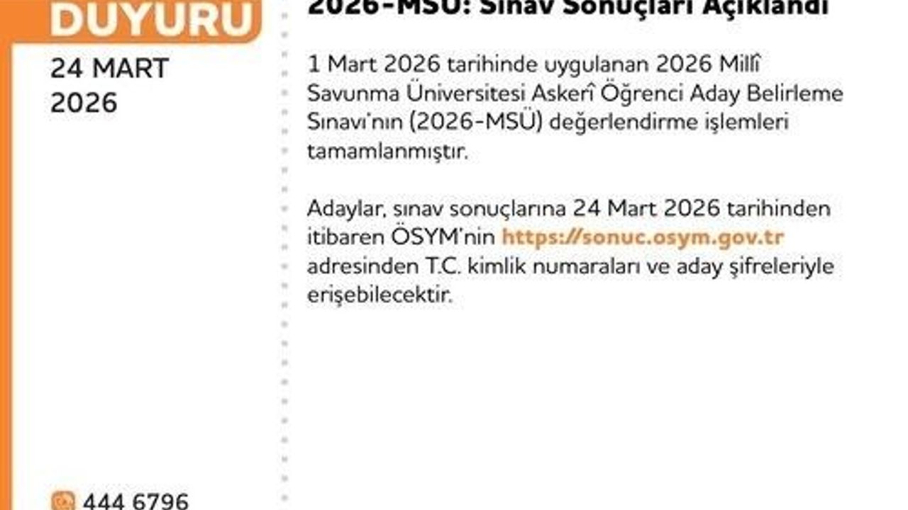 ÖSYM, 2026 yılı MSÜ değerlendirme işlemlerinin tamamlandığını belirterek, '1 Mart 2026 tarihinde uygulanan 2026 Milli avunma Üniversitesi Askeri Öğrenci Aday Belirleme Sınavı'nın (2026-MSÜ) değerlendirme işlemleri tamamlanmıştır. Adaylar, sınav sonuçlarına 24 Mart 2026 tarihinde saat 10.05'ten itibaren, ÖSYM'nin https://sonuc.osym.gov.tr adresinden T.C. kimlik numaraları ve aday şifreleriyle erişebilecektir. Adaylara ve kamuoyuna saygıyla duyurulur' ifadelerine yer verdi.
