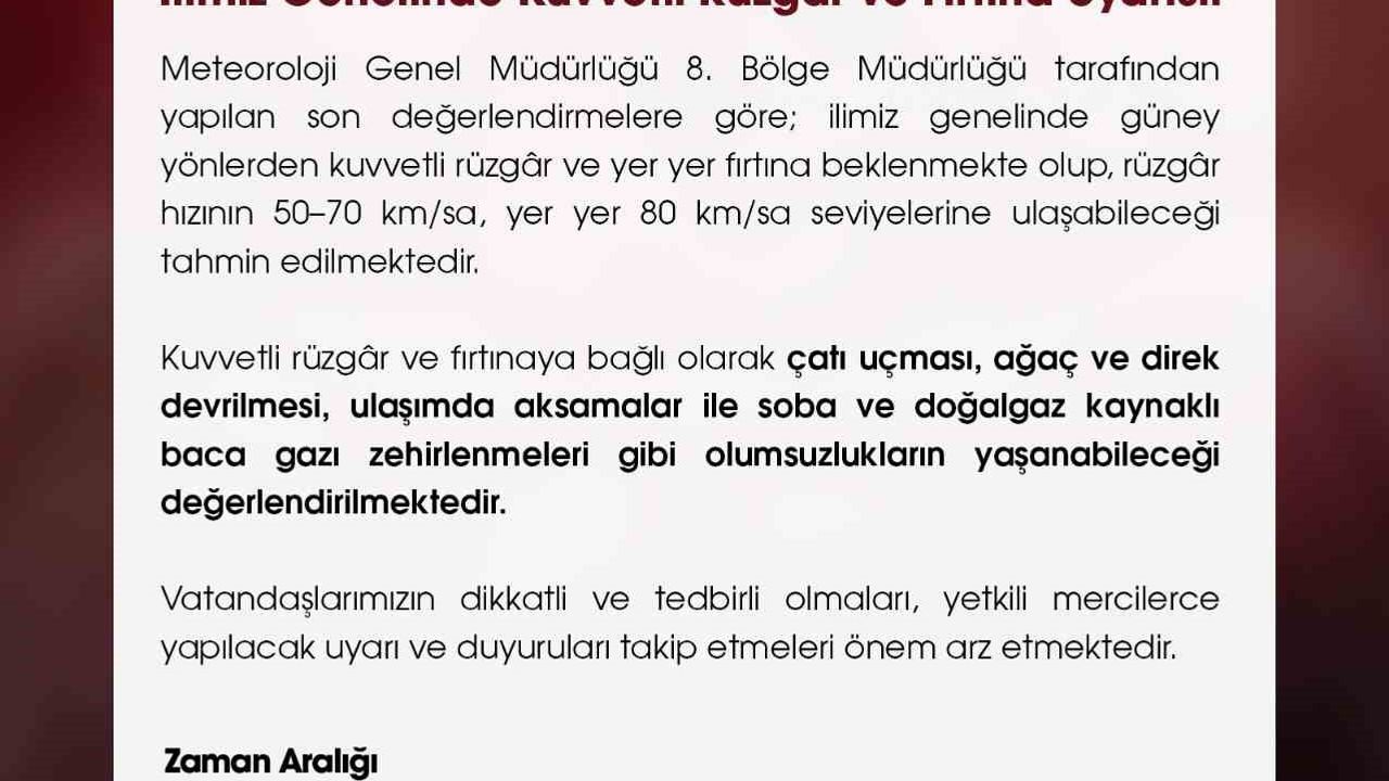 Yapılan açıklamaya göre, Niğde genelinde rüzgarın güney yönlerden kuvvetli eseceği, rüzgar hızının 50-70 kilometre/saat, yer yer ise 80 kilometre/saat seviyelerine ulaşabileceği tahmin ediliyor. 2 Şubat 2026 Pazartesi günü saat 00.00'dan başlayan kuvvetli rüzgar ve fırtınanın saat 23.59'a kadar etkili olması bekleniyor. Valilik tarafından yapılan uyarıda, olumsuz hava şartlarına bağlı olarak çatı uçması, ağaç ve direk devrilmesi, ulaşımda aksamalar ile soba ve doğalgaz kaynaklı baca gazı zehirlenmeleri gibi risklerin oluşabileceğine dikkat çekilerek vatandaşların dikkatli ve tedbirli olmaları, uyarı ve duyuruları yakından takip etmelerinin büyük önem taşıdığı vurgulandı.