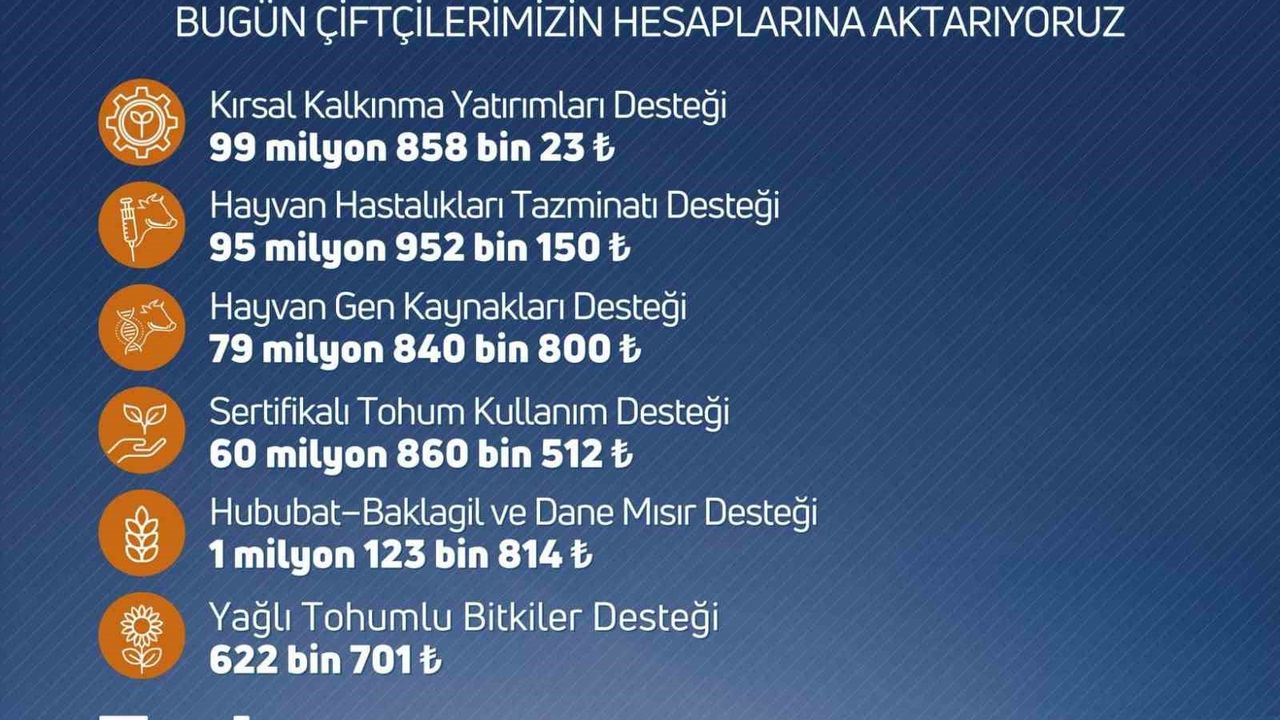 Yapılan bilgilendirmede, kırsal kalkınma yatırımları, hayvan hastalıkları tazminatı, hayvan gen kaynakları, sertifikalı tohum kullanımı, hububat, baklagil ve dane mısır ile yağlı tohumlu bitkiler destekleri kapsamında üreticilere ödeme yapılacağı belirtildi.