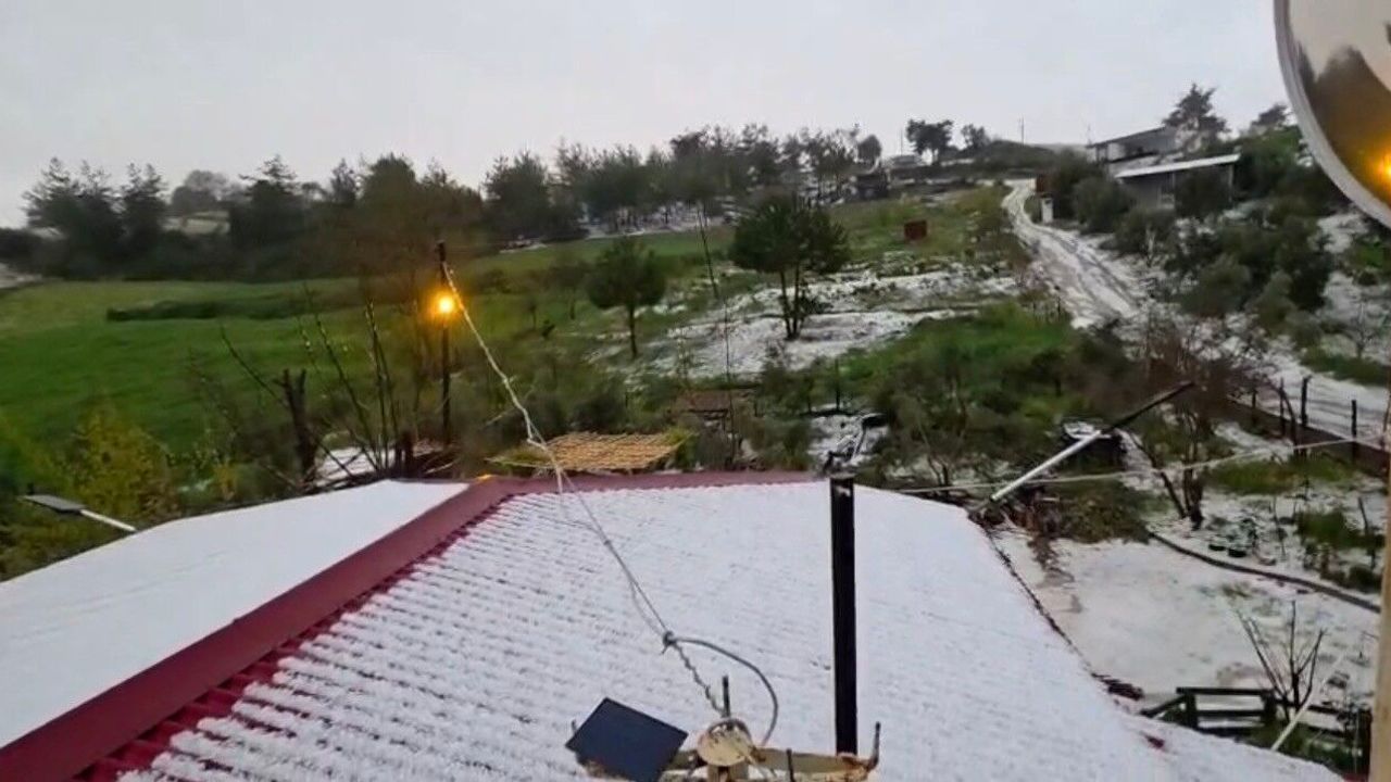Osmaniye'nin Kadirli ilçesinde akşam saatlerinde etkili olan şiddetli yağmur ve dolu, çatıları beyaza bürüdü.