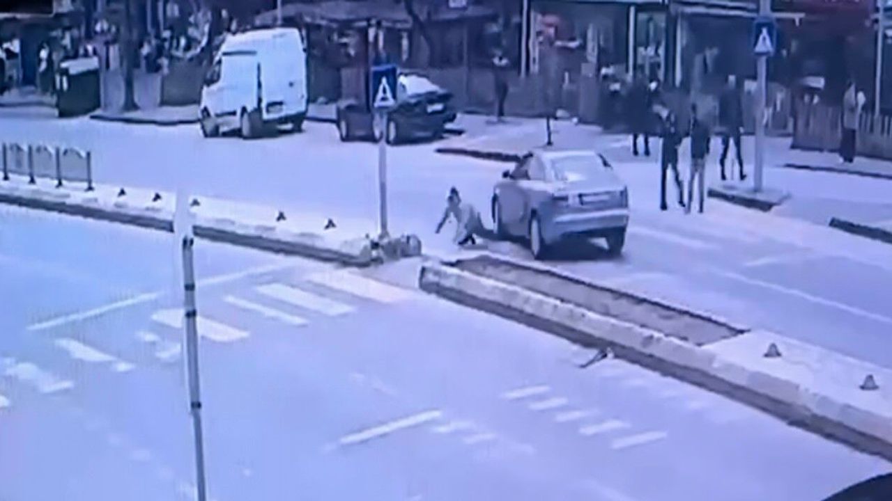 Edirne'de yaya geçidinden yolun karşı tarafına geçmeye çalışan vatandaşa otomobilin çarptığı anlar güvenlik kamerasına yansıdı.