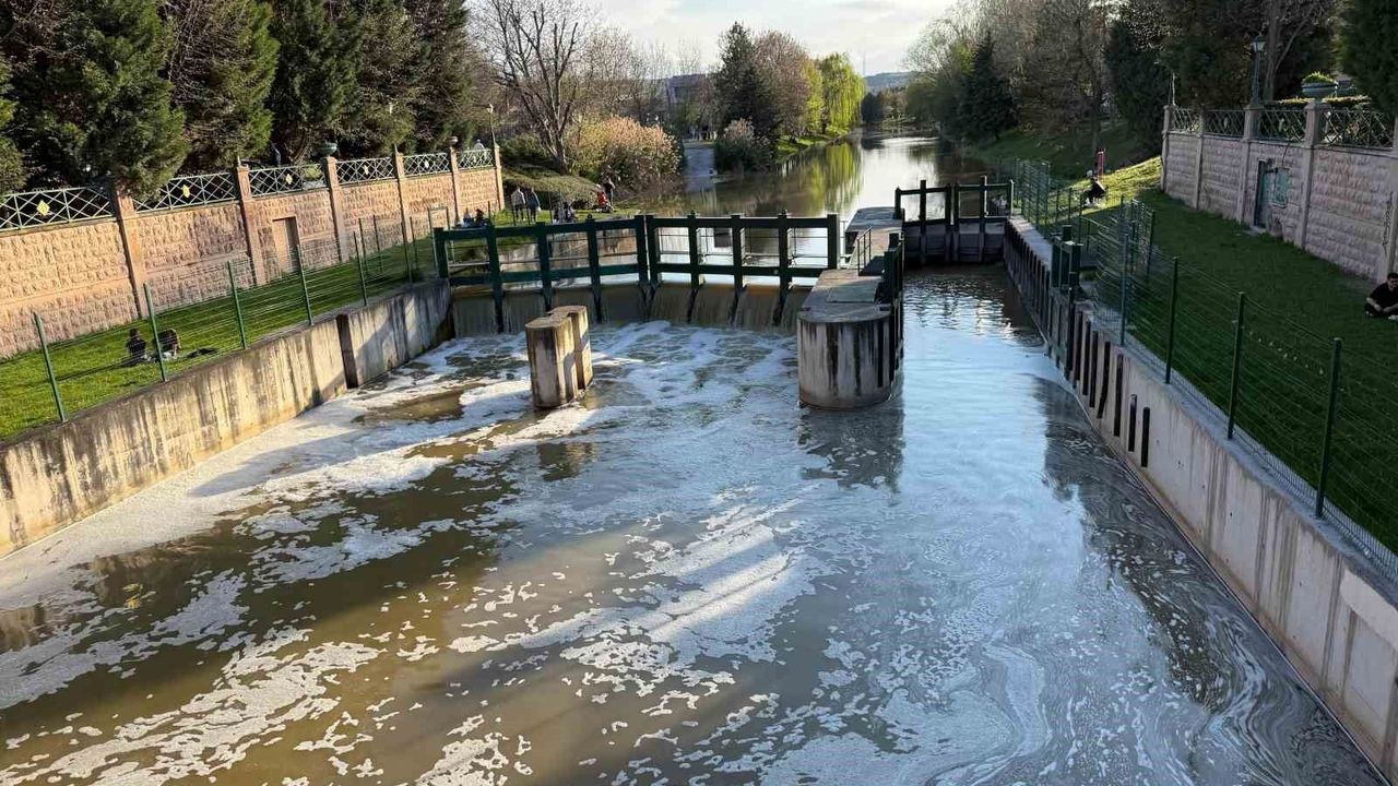 Eskişehir'de Porsuk Çayı'nın yüzeyinde yağmur sonrası oluştuğu tahmin edilen yoğun beyaz köpük tabakalar dikkat çekti.