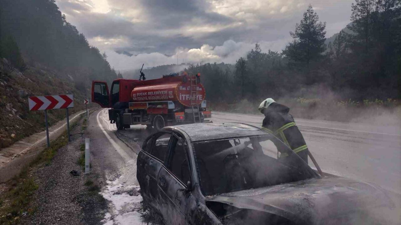 Burdur'un Bucak ilçesinde seyir halindeyken araçta çıkan yangın itfaiye ekipleri tarafından söndürülürken araç kullanılmaz hale geldi.