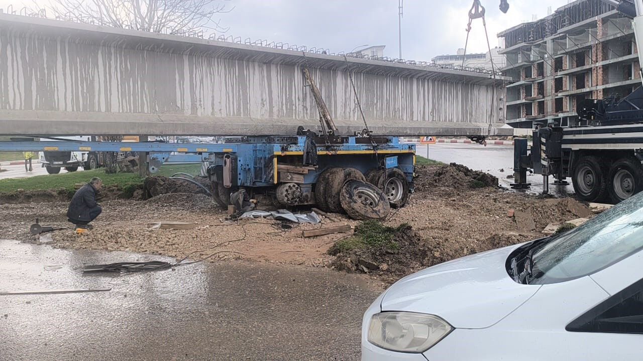 Siirt'te yapımı süren viyadük projesi için kente getirilen dev köprü kirişi, yüklendiği tır dönüş yaparken kavşakta takılı kaldı. Yol kapanırken, ekiplerin yolu açma çalışmaları devam ediyor.