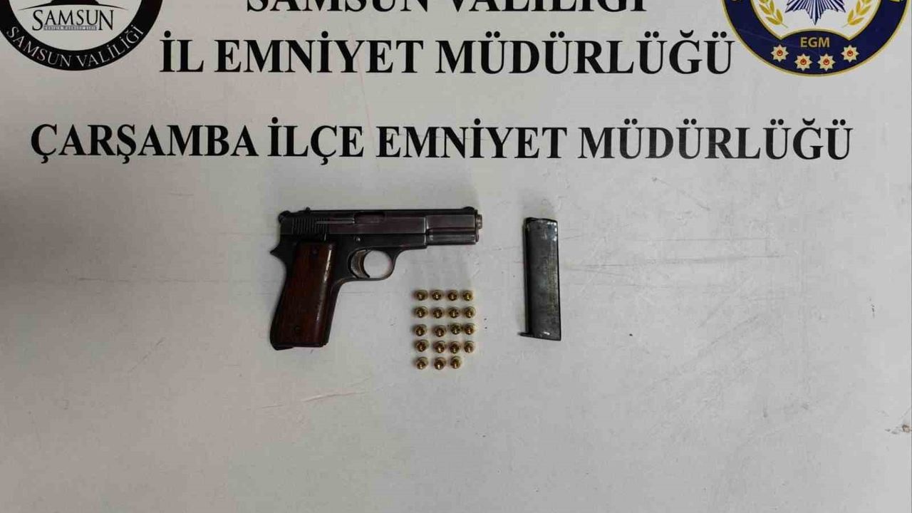 Salıpazarı ilçesinde 1 kişinin tabancayla vurularak yaralandığı olayın şüphelisi M.K.'nin 55 RZ 184 plakalı araçla Çarşamba ilçesine geldiği tespit edildi. Çarşamba İlçe Emniyet Müdürlüğü ekipleri tarafından yürütülen çalışmalarda, söz konusu araç Kirazlıkçay Mahallesi'nde şüphelinin babasına ait evin arka sokağında park halinde bulundu. Bir süre sonra aracın yanına gelen M.K., yakalanarak gözaltına alındı. Şüphelinin tabancayı Karamustafalı Mahallesi'nde kendisine ait araziye attığını söylemesi üzerine polis ekipleri şahısla birlikte belirtilen adrese gitti. Yapılan aramada 1 adet 7,65 mm çapında ruhsatsız tabanca ile 19 adet fişek ele geçirildi.