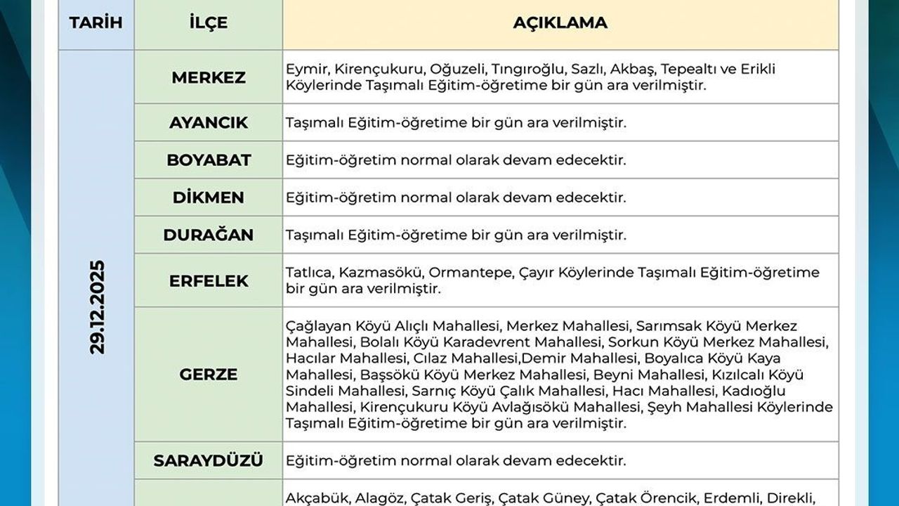 Sinop Valiliğinden yapılan açıklamada, olumsuz hava şartlarının ulaşımda risk oluşturabileceği değerlendirilerek 29 Aralık 2025 Pazartesi günü Ayancık ve Durağan ilçelerinde taşımalı eğitimin tamamen durdurulduğu bildirildi. Merkez ilçe ile birlikte Erfelek, Gerze ve Türkeli'nin bazı bölgelerinde ise taşımalı eğitime kısmi olarak ara verildi. Boyabat, Dikmen ve Saraydüzü ilçelerinde eğitim öğretimin normal şekilde devam edeceği ifade edildi.