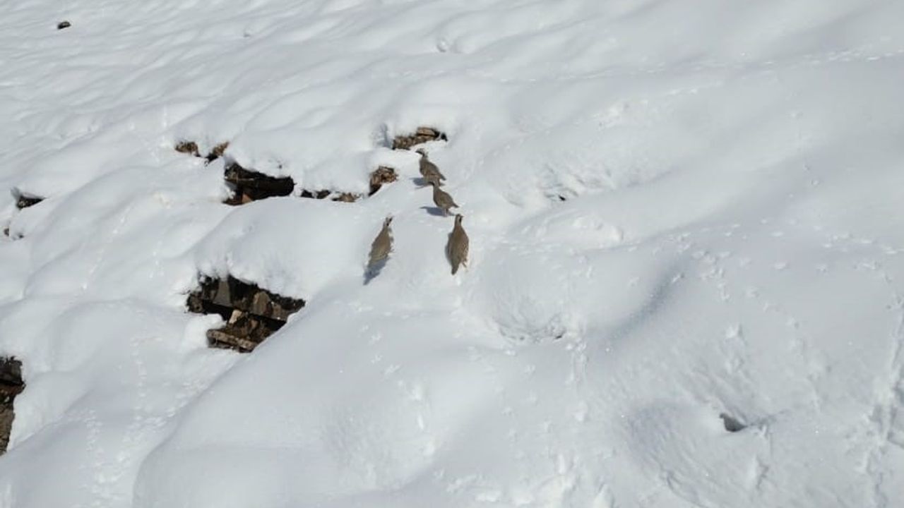 Şırnak'ın Beytüşşebap ilçesinde dondurucu soğuklar ve kar nedeni ile doğal yaşam alanlarında yiyecek bulamayan keklikler sürü halinde sıcak alanlara inip yiyecek aradı.