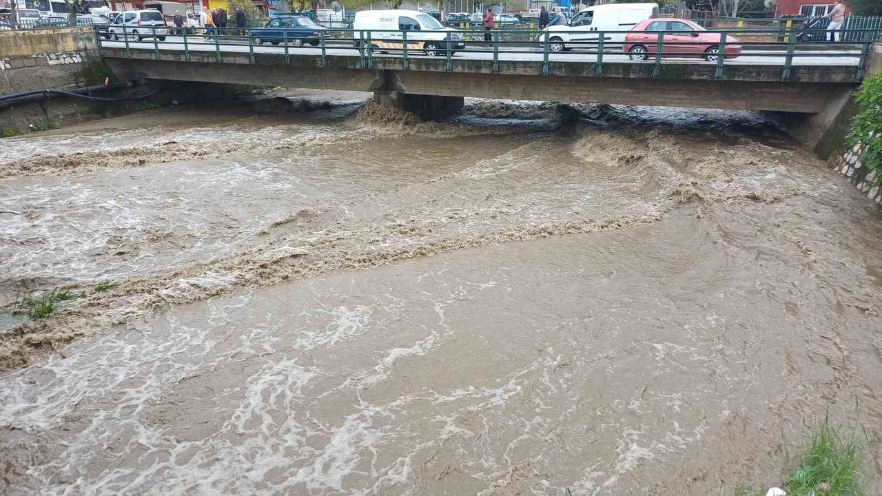 Aydın'ın merkez ilçesi Efeler'de etkili olan sağanak yağışın ardından yağmur suları Tabakhane Deresi'ni coştururken, derede su seviyesi yükseldi.
