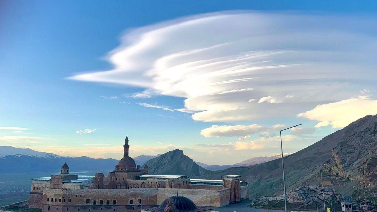 Ağrı'nın Doğubayazıt ilçesinde İshak Paşa Sarayı üzerinde oluşan mercek bulutları, gökyüzünde görsel şölen sundu.