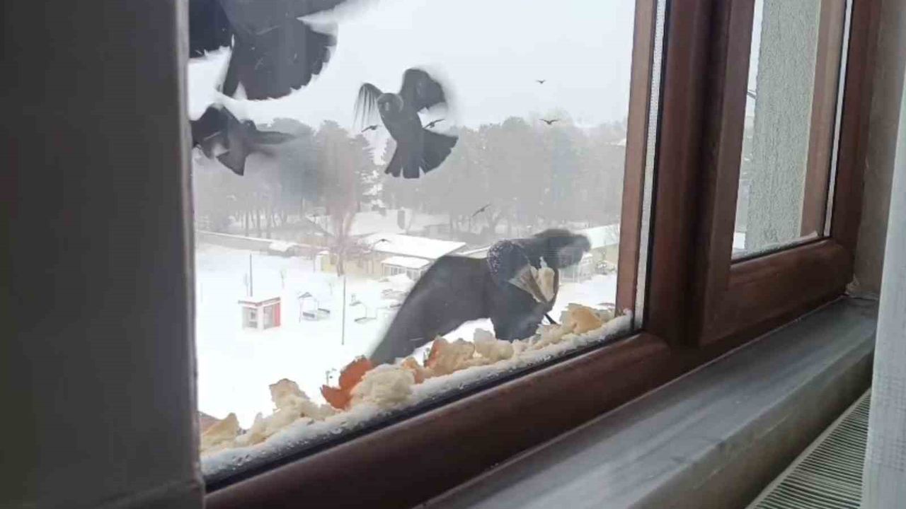 Öte yandan kuşların pencere önüne konulan ekmekleri kısa sürede tüketmesi kameraya yansıdı.