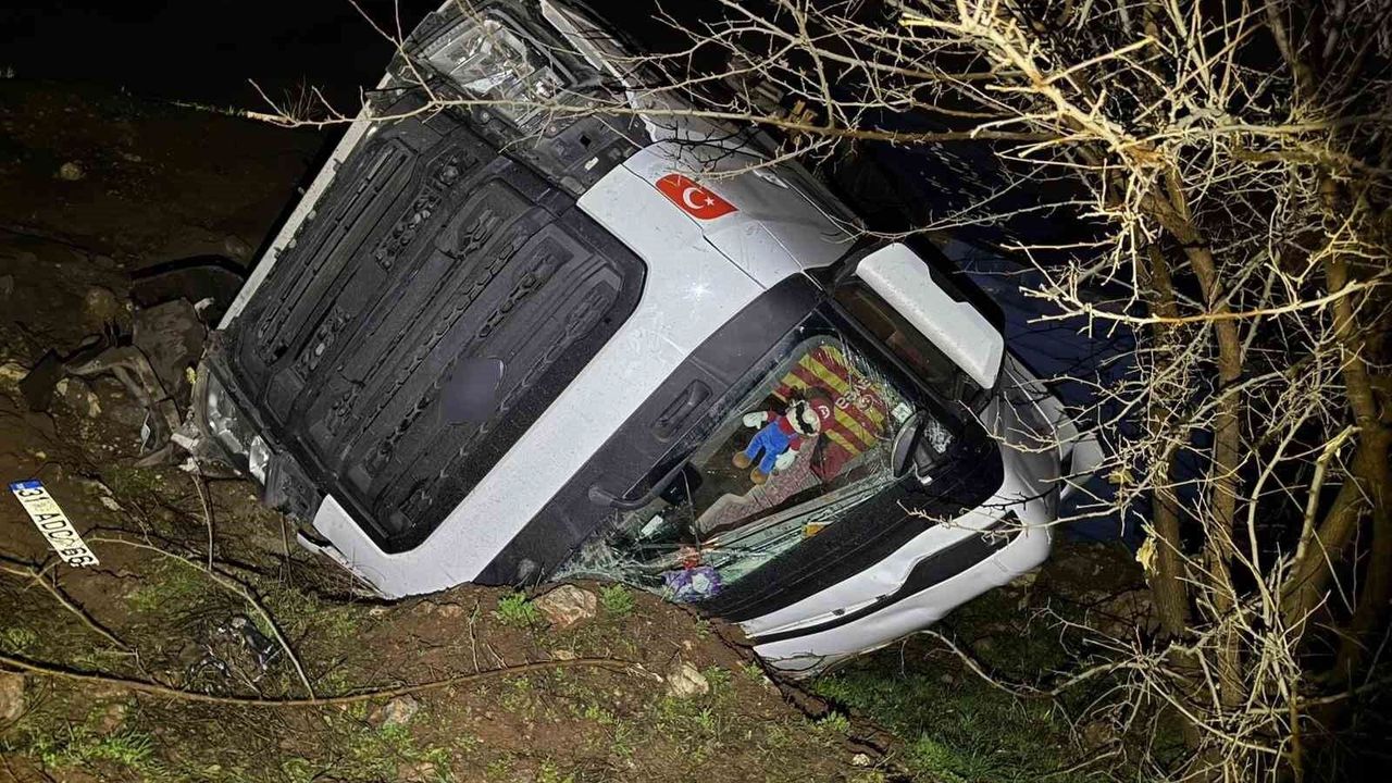 Adıyaman'da kontrolden çıkan tırın şarampole yuvarlanması sonucu sürücü yaralandı.