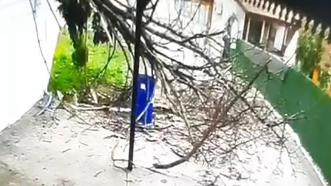 Tokat'tın Niksar ilçesinde etkili olan fırtına bir ağacı devirirken, kaldırımdan geçen bir kişi son anda kurtuldu. O anlar güvenlik kamerasına yansıdı.
