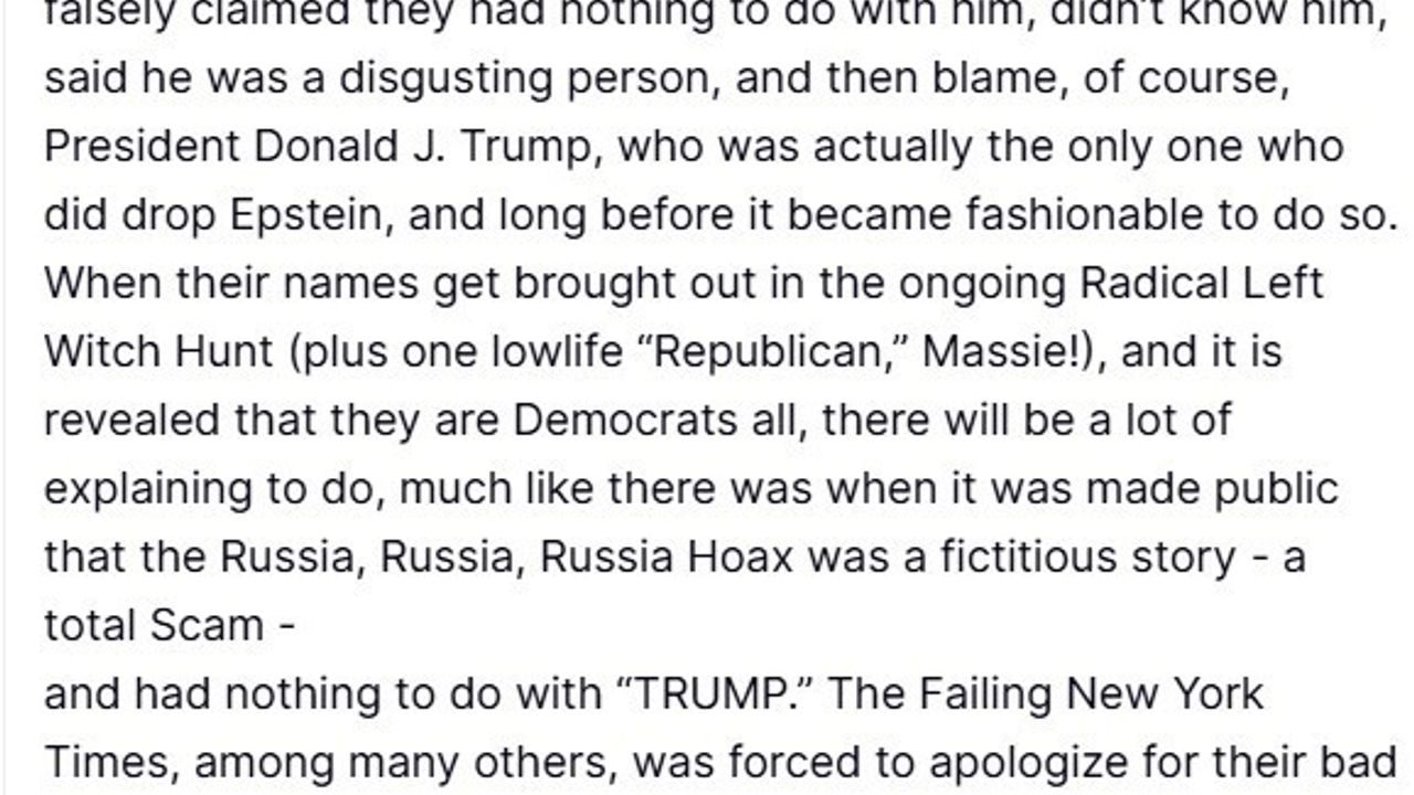 Yayınlanan Epstein belgeleri üzerinden yürütülen tartışmaların radikal solun yürüttüğü bir 'cadı avı' olduğunu iddia eden Trump, 'Adı geçen isimlerin hepsinin Demokrat olduğu anlaşıldığında, 'Rusya Rusya Rusya' aldatmacasının uydurma bir hikaye olduğu ve Trump ile hiçbir ilgisinin bulunmadığı kamuoyuna açıklandığında olduğu gibi açıklamaya muhtaç çok fazla konu olacak' ifadelerini kullandı.