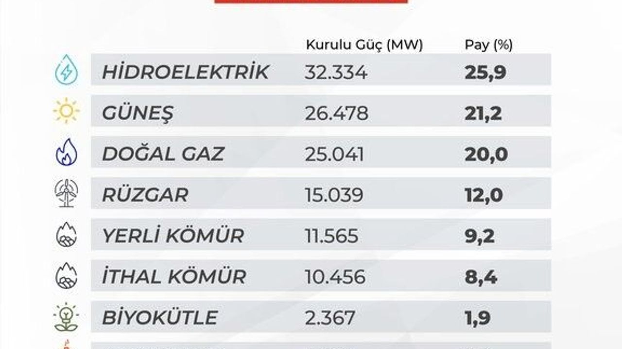 Verileri değerlendiren Enerji ve Tabii Kaynaklar Bakanı Alparslan Bayraktar, 'Elektrik kurulu gücümüz her geçen gün artmaya devam ederken, yenilenebilir enerjinin kurulu gücümüz içerisindeki payı da yükselişini sürdürüyor. Mart ayı sonu itibarıyla elektrik kurulu gücümüzde 26 bin 478 megavat ile güneşin payı yüzde 21,2'ye ulaştı. 2025 yılında yaklaşık 6 bin megavat güneş, 2 bin megavat rüzgâr kurulu gücünü devreye alarak bu alanda bir rekor kırdık. Güneş ve rüzgâr yatırımları, büyük bir hızla devam ediyor. Bu yıl sonunda toplam kurulu güçte en büyük pay güneşin olacak' açıklamasında bulundu.