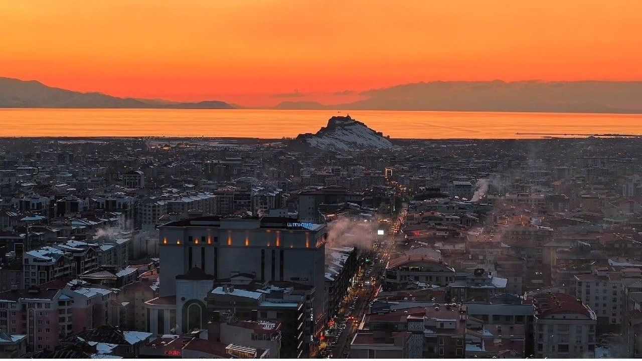 Doğası ve tarihi dokusuyla her mevsim ziyaretçilerini kendine hayran bırakan Van, akşam saatlerindeki gün batımı manzarasıyla kartpostallık görüntüler sundu. Dünyanın en büyük sodalı gölü olan Van Gölü'nün berrak suları üzerinde gün batımı renk skalasıyla seyri doyumsuz manzaralar oluşturdu.