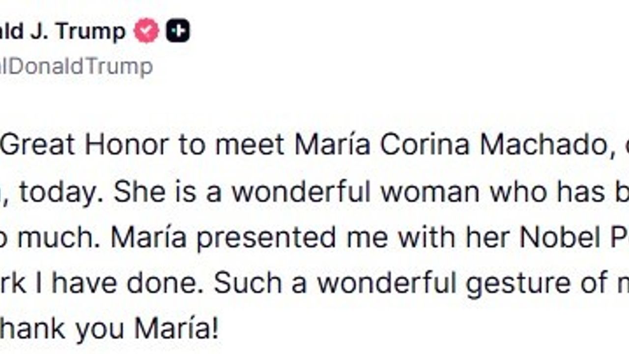 ABD Başkanı Donald Trump ise kendisine ait Truth sosyal medya platformundan yaptığı paylaşımda Machado'nun jestini doğrulayarak, 'Bugün Venezuela'dan Maria Corina Machado ile tanışmak benim için büyük bir onurdu. Çok şey yaşamış harika bir kadın. Maria, yaptığım çalışmalar nedeniyle bana Nobel Barış Ödülü'nü takdim etti. Karşılıklı saygının harika bir göstergesi. Teşekkür ederim Maria!' ifadelerini kullandı.