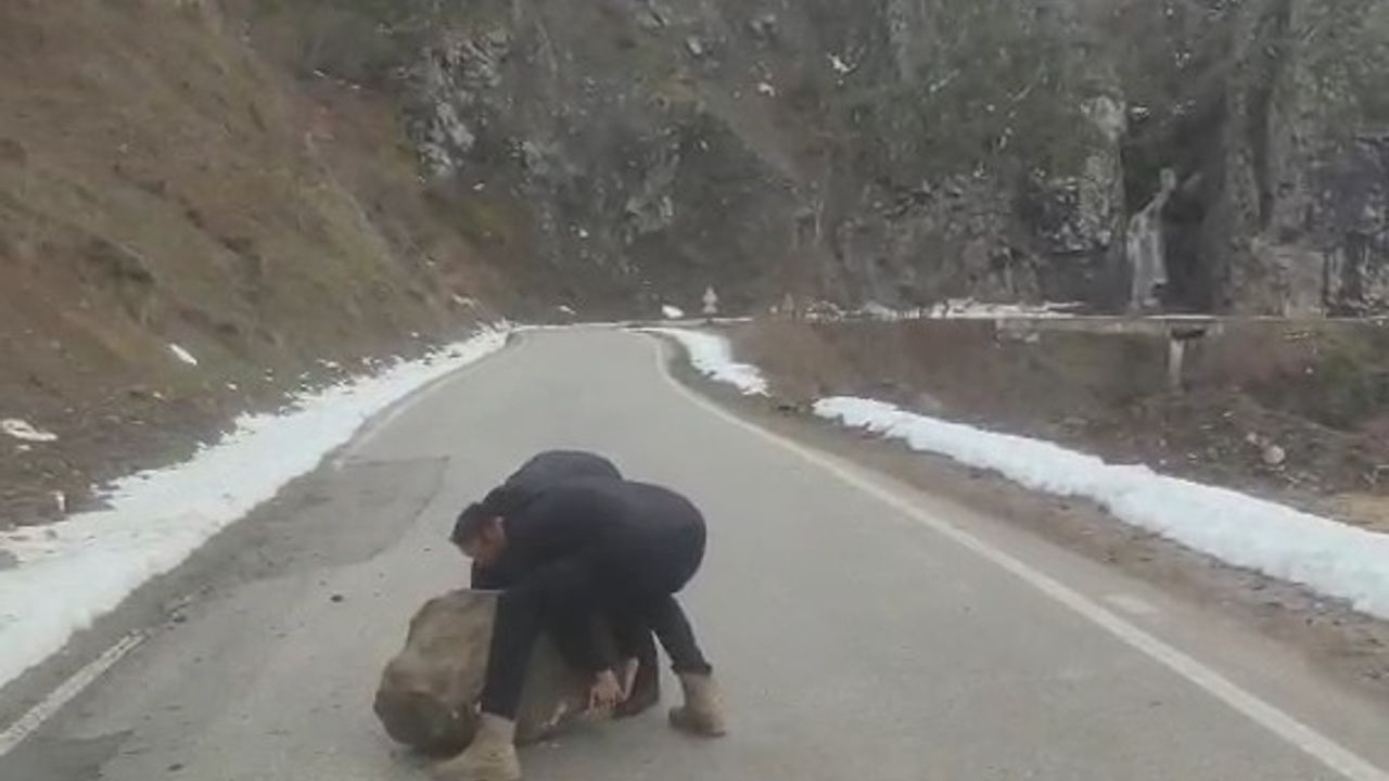 Tokat'ta seyir halindeyken yola düşen kaya parçası, vatandaşları dikkati ve duyarlı davranışı sayesinde tehlike oluşturmadan yol kenarına çekildi.