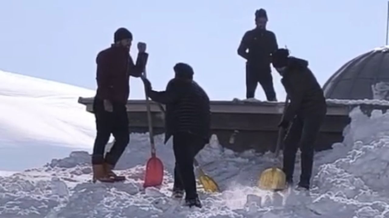 Hakkari'nin Yüksekova ilçesinde yoğun kar yağışının ardından karla kaplanan cami ve evlerin damları köy sakinlerince imece usulü temizlendi.