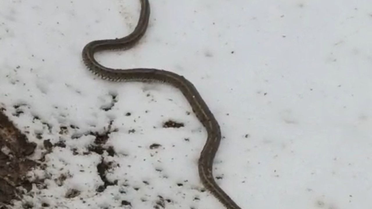 Kar üzerinde bir süre gezinen yılan, daha sonra gözden kayboldu.