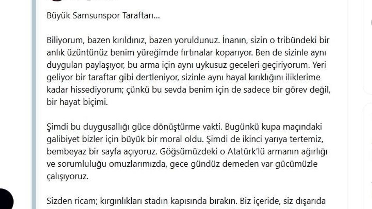 Maça gelen taraftar sayısındaki büyük düşüşün ardından taraftara seslenen Başkan Yıldırım, 'Büyük Samsunspor taraftarı; biliyorum bazen kırıldınız, bazen yoruldunuz. İnanın, sizin o tribündeki bir anlık üzüntünüz benim yüreğimde fırtınalar koparıyor. Ben de sizinle aynı duyguları paylaşıyor, bu arma için aynı uykusuz geceleri geçiriyorum. Yeri geliyor bir taraftar gibi dertleniyor, sizinle aynı hayal kırıklığını iliklerime kadar hissediyorum; çünkü bu sevda benim için de sadece bir görev değil, bir hayat biçimi. Şimdi bu duygusallığı güce dönüştürme vakti. Dünkü kupa maçındaki galibiyet bizler için büyük bir moral oldu. Şimdi de ikinci yarıya tertemiz, bembeyaz bir sayfa açıyoruz' dedi.